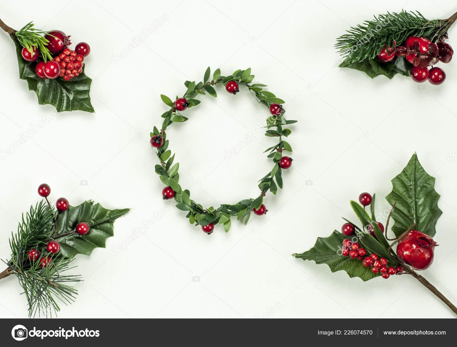 クリスマスに年末年始組成 グリーン ホリデー リース 緑の枝 赤い果実 ギフトのコピーと白い背景の上のスペース テキスト メリークリスマス — ストック写真 © magiurg #226074570
