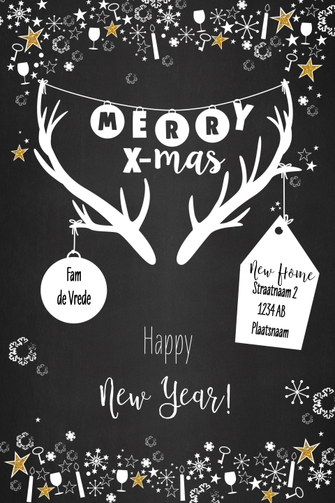 Kerst verhuiskaart zwart wit met rendier gewei en versiering